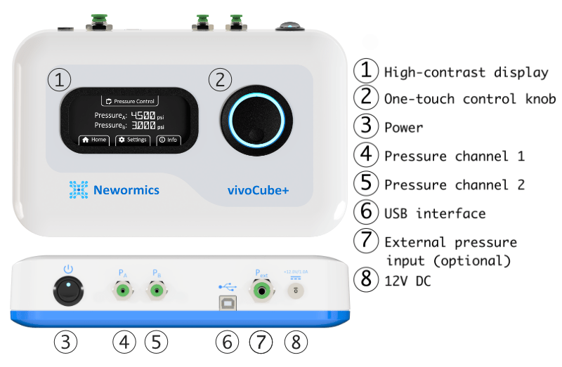 vivoVerse's vivoCube®+ is the latest version of our popular vivoCube microfluidics controller used in labs worldwide. Reengineered from the ground up, it provides users with an all-in-one solution for delivering, smooth accurate pressure driven flow for their experiments. It features two independently controllable pressure outputs supplied by an internal pump to drive flow from different liquid reservoirs, or supply fast, accurate pressure stimuli. The vivoCube+ is fully portable and more compact than other microfluidic flow controllers to allow it to fit in anywhere on your benchtop. No PC is required. Users can program virtually any series of pressure sequences directly on the unit using the intuitive vivoCubeOS and walk away.
